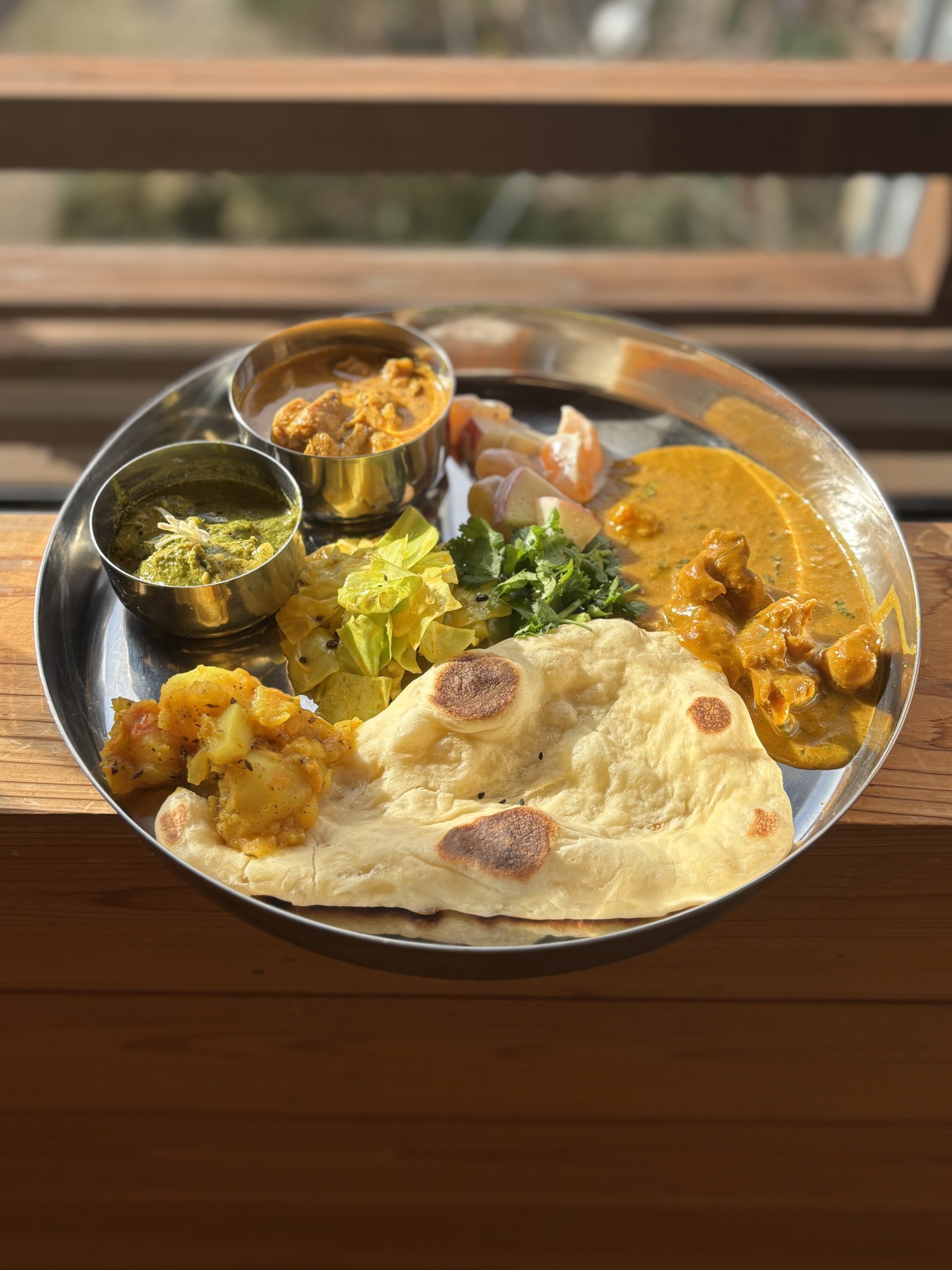 ギーやホールスパイスが決め手の濃厚な味わいと近江八幡のお野菜を使った副菜の組み合わせ。